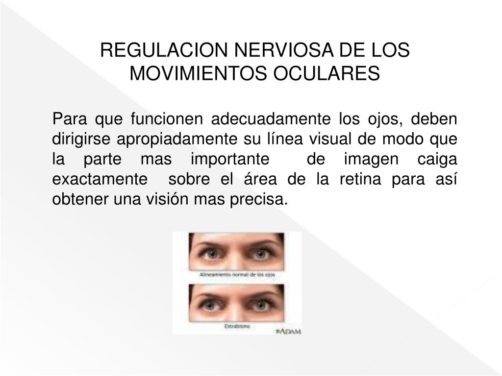 REGULACION NERVIOSA DE LOS MOVIMIENTOS OCULARES Para que funcionen adecuadamente los ojos, deben dirigirse apropiadamente su línea visual de modo que la parte mas importante de imagen caiga exactamente sobre el área de la retina para así obtener una visión mas precisa.