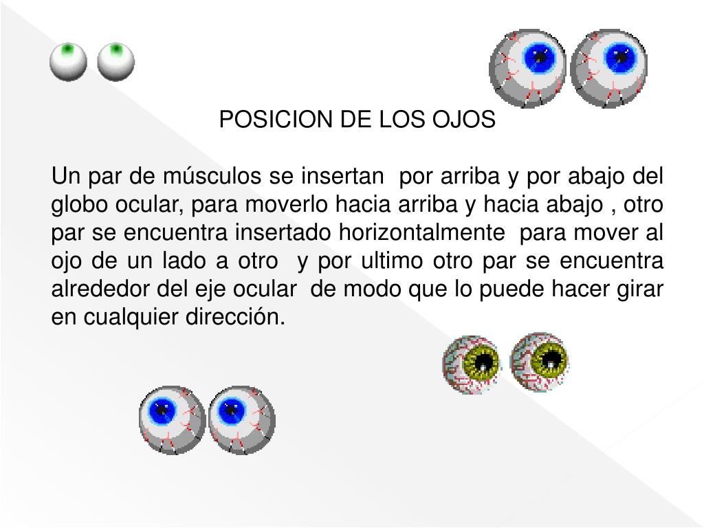 POSICION DE LOS OJOS Un par de músculos se insertan por arriba y por abajo del globo ocular, para moverlo hacia arriba y hacia abajo , otro par se encuentra insertado horizontalmente para mover al ojo de un lado a otro y por ultimo otro par se encuentra alrededor del eje ocular de modo que lo puede hacer girar en cualquier dirección.