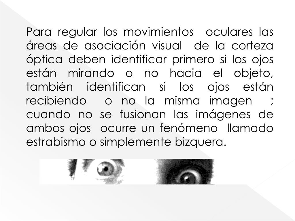 Para regular los movimientos oculares las áreas de asociación visual de la corteza óptica deben identificar primero si los ojos están mirando o no hacia el objeto, también identifican si los ojos están recibiendo o no la misma imagen ; cuando no se fusionan las imágenes de ambos ojos ocurre un fenómeno llamado estrabismo o simplemente bizquera.