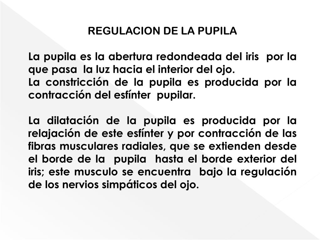 REGULACION DE LA PUPILA La pupila es la abertura redondeada del iris por la que pasa la luz hacia el interior del ojo. La constricción de la pupila es producida por la contracción del esfínter pupilar. La dilatación de la pupila es producida por la relajación de este esfínter y por contracción de las fibras musculares radiales, que se extienden desde el borde de la pupila hasta el borde exterior del iris; este musculo se encuentra bajo la regulación de los nervios simpáticos del ojo.