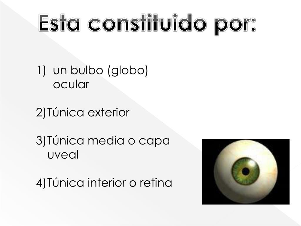 Esta constituido por: un bulbo (globo) ocular Túnica exterior Túnica media o capa uveal Túnica interior o retina