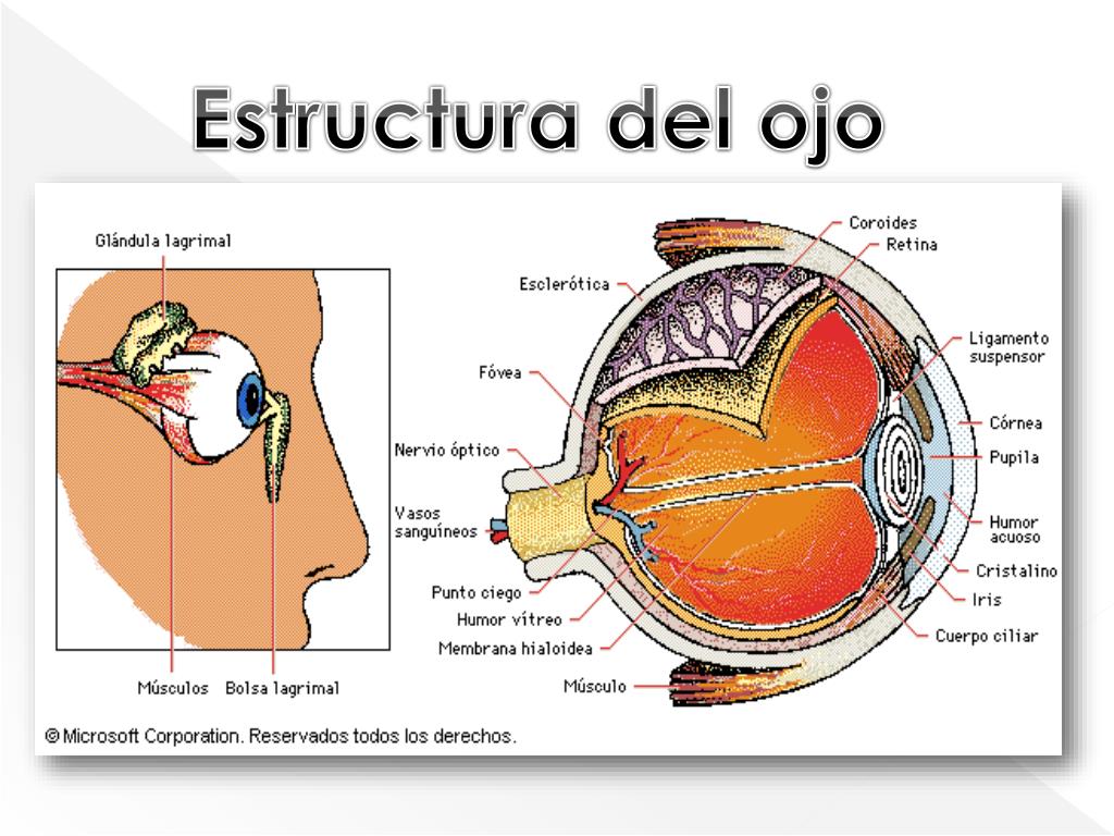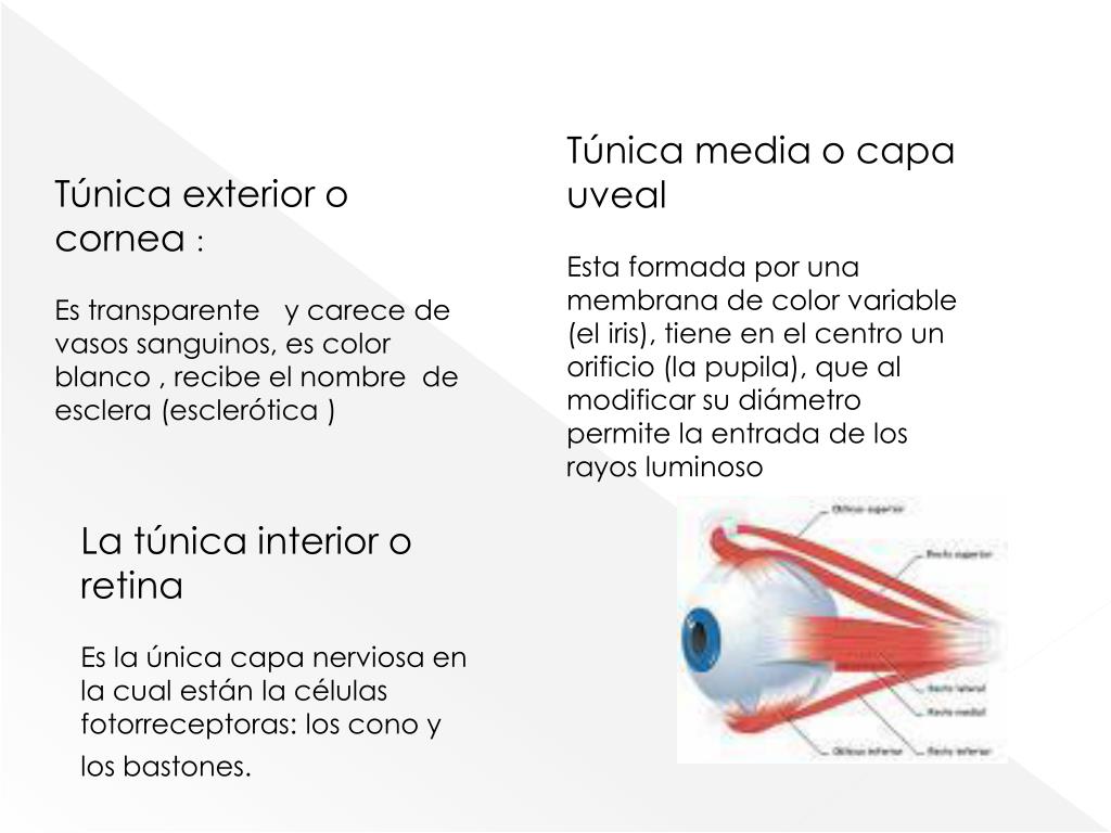Túnica media o capa uveal Esta formada por una membrana de color variable (el iris), tiene en el centro un orificio (la pupila), que al modificar su diámetro permite la entrada de los rayos luminoso Túnica exterior o cornea : Es transparente y carece de vasos sanguinos, es color blanco , recibe el nombre de esclera (esclerótica ) La túnica interior o retina Es la única capa nerviosa en la cual están la células fotorreceptoras: los cono y los bastones.