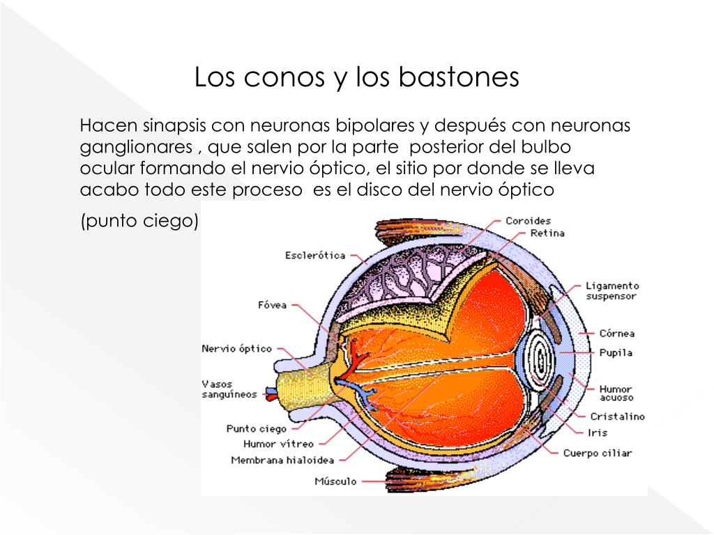 Los conos y los bastones Hacen sinapsis con neuronas bipolares y después con neuronas ganglionares , que salen por la parte posterior del bulbo ocular formando el nervio óptico, el sitio por donde se lleva acabo todo este proceso es el disco del nervio óptico (punto ciego)