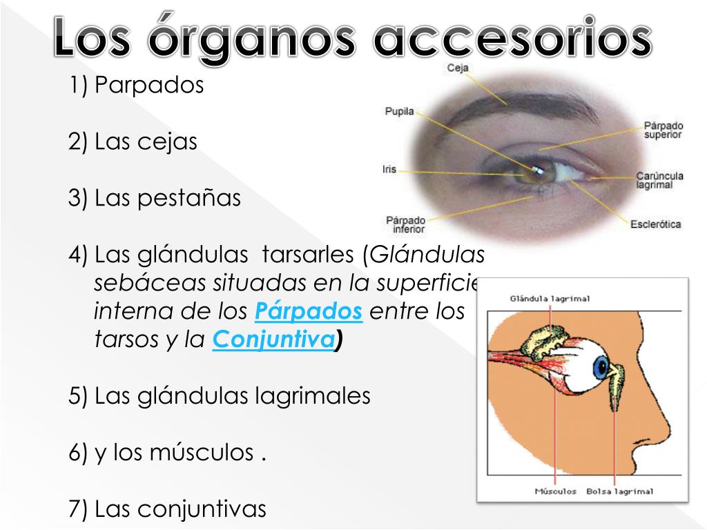 Los órganos accesorios Parpados Las cejas Las pestañas Las glándulas tarsarles (Glándulas sebáceas situadas en la superficie interna de los Párpados entre los tarsos y la Conjuntiva) Las glándulas lagrimales y los músculos . Las conjuntivas