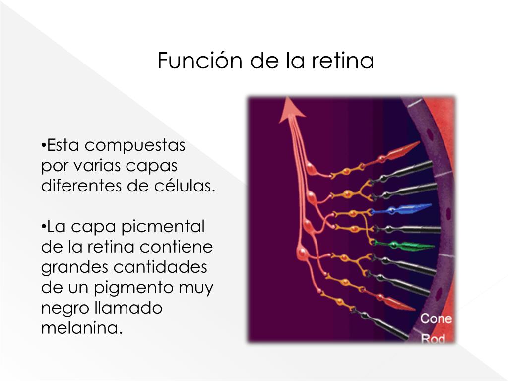 Función de la retina • Esta compuestas por varias capas diferentes de células. • La capa picmental de la retina contiene grandes cantidades de un pigmento muy negro llamado melanina.