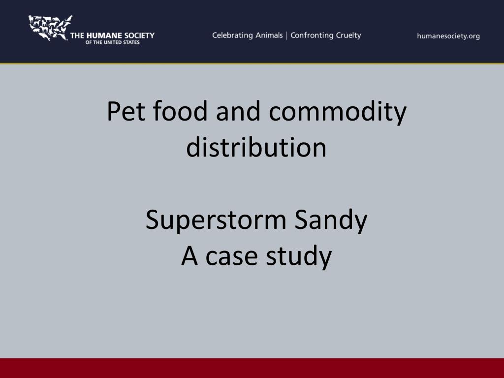 Pet food and commodity distribution Superstorm Sandy A case study. Superstorm Sandy Best Practices. Effective large-scale pet response cannot be accomplished by any single entity Commodity distribution of donated pet food and supplies