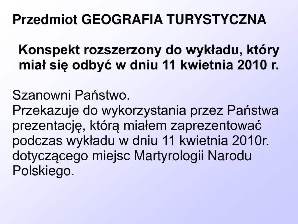 Przedmiot GEOGRAFIA TURYSTYCZNA Konspekt rozszerzony do wykładu, który miał się odbyć w dniu 11 kwietnia 2010 r. Szanowni Państwo. Przekazuje do wykorzystania przez Państwa prezentację, którą miałem zaprezentować podczas wykładu w dniu 11 kwietnia 2010r. dotyczącego miejsc Martyrologii Narodu Polskiego.