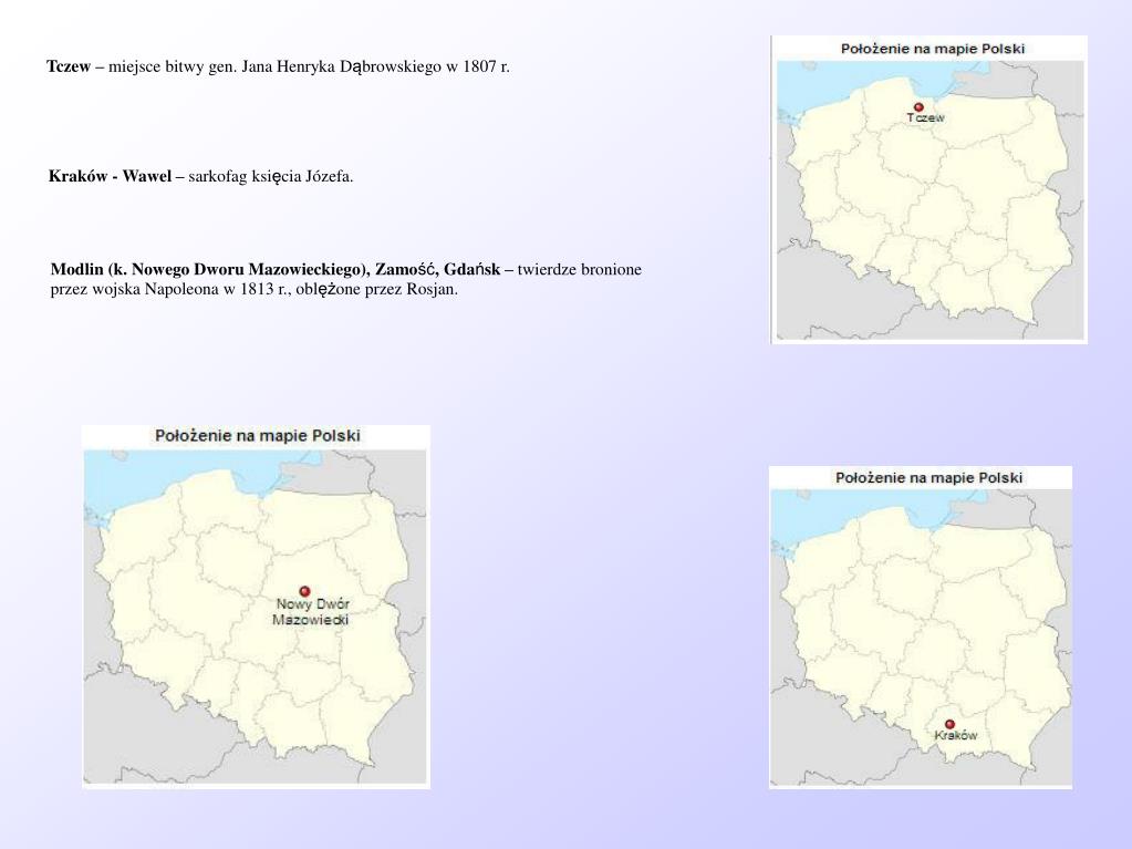 Tczew – miejsce bitwy gen. Jana Henryka Dąbrowskiego w 1807 r. Kraków - Wawel – sarkofag księcia Józefa. Modlin (k. Nowego Dworu Mazowieckiego), Zamość, Gdańsk – twierdze bronione przez wojska Napoleona w 1813 r., oblężone przez Rosjan.
