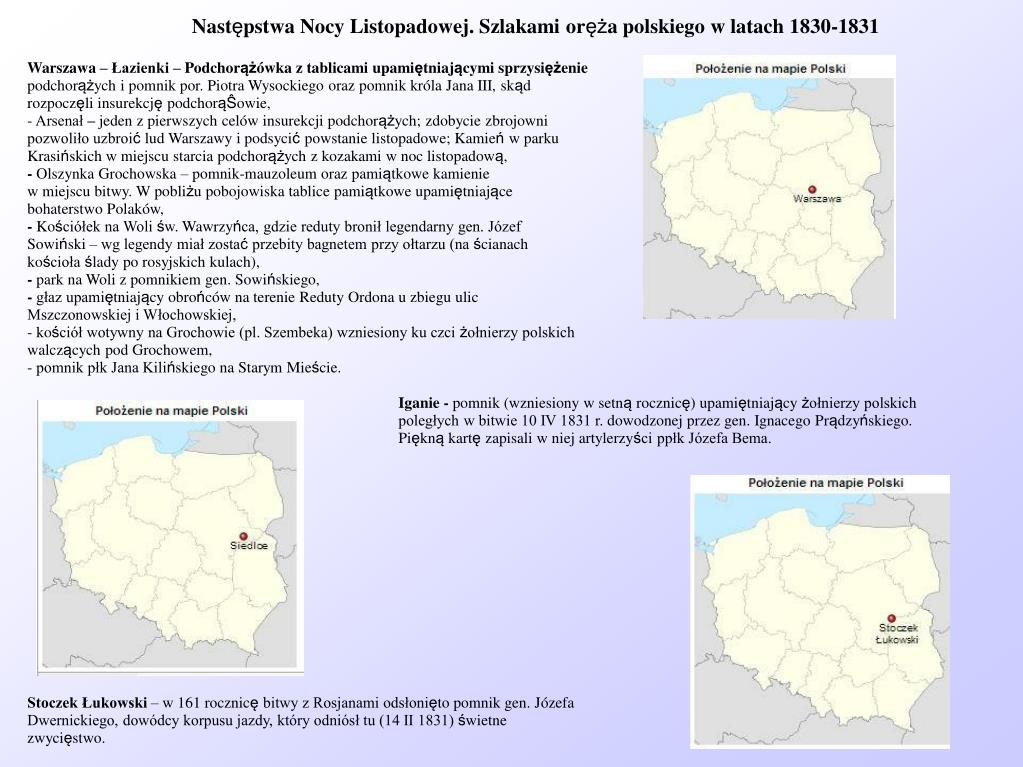 Następstwa Nocy Listopadowej. Szlakami oręża polskiego w latach 1830-1831 Warszawa – Łazienki – Podchorążówka z tablicami upamiętniającymi sprzysiężenie podchorążych i pomnik por. Piotra Wysockiego oraz pomnik króla Jana III, skąd rozpoczęli insurekcję podchorąŜowie, - Arsenał – jeden z pierwszych celów insurekcji podchorążych; zdobycie zbrojowni pozwoliło uzbroić lud Warszawy i podsycić powstanie listopadowe; Kamień w parku Krasińskich w miejscu starcia podchorążych z kozakami w noc listopadową, - Olszynka Grochowska – pomnik-mauzoleum oraz pamiątkowe kamienie w miejscu bitwy. W pobliżu pobojowiska tablice pamiątkowe upamiętniające bohaterstwo Polaków, - Kościółek na Woli św. Wawrzyńca, gdzie reduty bronił legendarny gen. Józef Sowiński – wg legendy miał zostać przebity bagnetem przy ołtarzu (na ścianach kościoła ślady po rosyjskich kulach), - park na Woli z pomnikiem gen. Sowińskiego, - głaz upamiętniający obrońców na terenie Reduty Ordona u zbiegu ulic Mszczonowskiej i Włochowskiej, - kościół wotywny na Grochowie (pl. Szembeka) wzniesiony ku czci żołnierzy polskich walczących pod Grochowem, - pomnik płk Jana Kilińskiego na Starym Mieście. Iganie - pomnik (wzniesiony w setną rocznicę) upamiętniający żołnierzy polskich poległych w bitwie 10 IV 1831 r. dowodzonej przez gen. Ignacego Prądzyńskiego. Piękną kartę zapisali w niej artylerzyści ppłk Józefa Bema. Stoczek Łukowski – w 161 rocznicę bitwy z Rosjanami odsłonięto pomnik gen. Józefa Dwernickiego, dowódcy korpusu jazdy, który odniósł tu (14 II 1831) świetne zwycięstwo. Zakroczym – klasztor oo. kapucynów (tablica w refektarzu upamiętniająca ostatnie posiedzenie Sejmu Polskiego). Kapciamiestie (Kopciowo) (ob. Litwa) – pomnik i grób Emilii Plater. Justianowice (ob. Litwa) – dwór, w którym zmarła Emilia Plater.