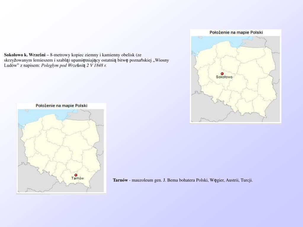 Sokołowo k. Wrześni – 8-metrowy kopiec ziemny i kamienny obelisk (ze skrzyżowanym lemieszem i szablą) upamiętniający ostatnią bitwę poznańskiej „Wiosny Ludów” z napisem: Poległym pod Wrześnią 2 V 1848 r. Tarnów - mauzoleum gen. J. Bema bohatera Polski, Węgier, Austrii, Turcji.