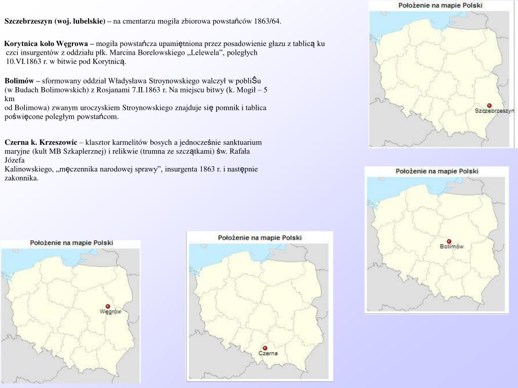 Szczebrzeszyn (woj. lubelskie) – na cmentarzu mogiła zbiorowa powstańców 1863/64. Korytnica koło Węgrowa – mogiła powstańcza upamiętniona przez posadowienie głazu z tablicą ku czci insurgentów z oddziału płk. Marcina Borelowskiego „Lelewela”, poległych 10.VI.1863 r. w bitwie pod Korytnicą. Bolimów – sformowany oddział Władysława Stroynowskiego walczył w pobliŜu (w Budach Bolimowskich) z Rosjanami 7.II.1863 r. Na miejscu bitwy (k. Mogił – 5 km od Bolimowa) zwanym uroczyskiem Stroynowskiego znajduje się pomnik i tablica poświęcone poległym powstańcom. Czerna k. Krzeszowic – klasztor karmelitów bosych a jednocześnie sanktuarium maryjne (kult MB Szkaplerznej) i relikwie (trumna ze szczątkami) św. Rafała Józefa Kalinowskiego, „męczennika narodowej sprawy”, insurgenta 1863 r. i następnie zakonnika.