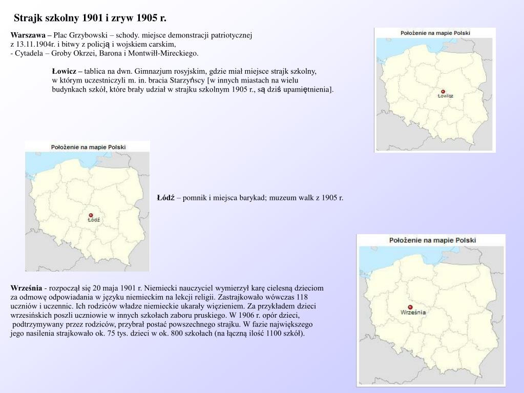 Strajk szkolny 1901 i zryw 1905 r. Warszawa – Plac Grzybowski – schody. miejsce demonstracji patriotycznej z 13.11.1904r. i bitwy z policją i wojskiem carskim, - Cytadela – Groby Okrzei, Barona i Montwiłł-Mireckiego. Łowicz – tablica na dwn. Gimnazjum rosyjskim, gdzie miał miejsce strajk szkolny, w którym uczestniczyli m. in. bracia Starzyńscy [w innych miastach na wielu budynkach szkół, które brały udział w strajku szkolnym 1905 r., są dziś upamiętnienia]. Łódź – pomnik i miejsca barykad; muzeum walk z 1905 r. Września - rozpoczął się 20 maja 1901 r. Niemiecki nauczyciel wymierzył karę cielesną dzieciom za odmowę odpowiadania w języku niemieckim na lekcji religii. Zastrajkowało wówczas 118 uczniów i uczennic. Ich rodziców władze niemieckie ukarały więzieniem. Za przykładem dzieci wrzesińskich poszli uczniowie w innych szkołach zaboru pruskiego. W 1906 r. opór dzieci, podtrzymywany przez rodziców, przybrał postać powszechnego strajku. W fazie największego jego nasilenia strajkowało ok. 75 tys. dzieci w ok. 800 szkołach (na łączną ilość 1100 szkół).