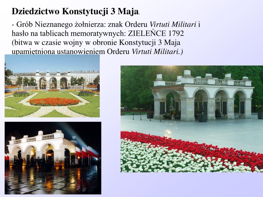 Dziedzictwo Konstytucji 3 Maja. - Grób Nieznanego żołnierza: znak Orderu Virtuti Militari i hasło na tablicach memoratywnych: ZIELEŃCE 1792 (bitwa w czasie wojny w obronie Konstytucji 3 Maja upamiętniona ustanowieniem Orderu Virtuti Militari.)