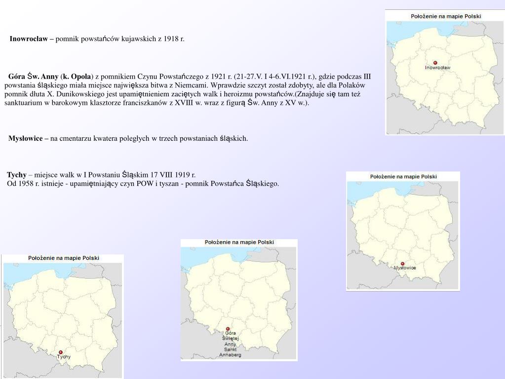 Inowrocław – pomnik powstańców kujawskich z 1918 r. Góra Św. Anny (k. Opola) z pomnikiem Czynu Powstańczego z 1921 r. (21-27.V. I 4-6.VI.1921 r.), gdzie podczas III powstania śląskiego miała miejsce największa bitwa z Niemcami. Wprawdzie szczyt został zdobyty, ale dla Polaków pomnik dłuta X. Dunikowskiego jest upamiętnieniem zaciętych walk i heroizmu powstańców.(Znajduje się tam teżsanktuarium w barokowym klasztorze franciszkanów z XVIII w. wraz z figurą Św. Anny z XV w.). Mysłowice – na cmentarzu kwatera poległych w trzech powstaniach śląskich. Tychy – miejsce walk w I Powstaniu Śląskim 17 VIII 1919 r. Od 1958 r. istnieje - upamiętniający czyn POW i tyszan - pomnik Powstańca Śląskiego.