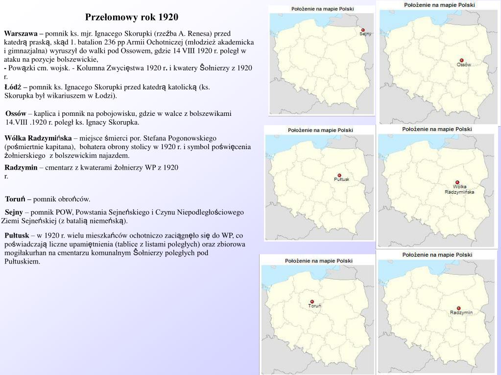 Przełomowy rok 1920 Warszawa – pomnik ks. mjr. Ignacego Skorupki (rzeźba A. Renesa) przed katedrą praską, skąd 1. batalion 236 pp Armii Ochotniczej (młodzieżakademicka i gimnazjalna) wyruszył do walki pod Ossowem, gdzie 14 VIII 1920 r. poległ w ataku na pozycje bolszewickie, - Powązki cm. wojsk. - Kolumna Zwycięstwa 1920 r. i kwatery Ŝołnierzy z 1920 r. Łódź – pomnik ks. Ignacego Skorupki przed katedrą katolicką (ks. Skorupka był wikariuszem w Łodzi). Ossów – kaplica i pomnik na pobojowisku, gdzie w walce z bolszewikami 14.VIII .1920 r. poległ ks. Ignacy Skorupka. Wólka Radzymińska – miejsce śmierci por. Stefana Pogonowskiego (pośmiertnie kapitana), bohatera obrony stolicy w 1920 r. i symbol poświęcenia żołnierskiego z bolszewickim najazdem. Radzymin – cmentarz z kwaterami żołnierzy WP z 1920 r. Toruń – pomnik obrońców. Sejny – pomnik POW, Powstania Sejneńskiego i Czynu Niepodległościowego Ziemi Sejneńskiej (z batalią niemeńską). Pułtusk – w 1920 r. wielu mieszkańców ochotniczo zaciągnęło się do WP, co poświadczają liczne upamiętnienia (tablice z listami poległych) oraz zbiorowa mogiłakurhan na cmentarzu komunalnym Ŝołnierzy poległych pod Pułtuskiem.