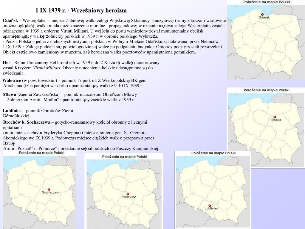 1 IX 1939 r. - Wrześniowy heroizm Gdańsk – Westerplatte – miejsce 7-dniowej walki załogi Wojskowej Składnicy Tranzytowej (ruiny z koszar i wartownie można oglądać); walka miała duże znaczenie moralne i propagandowe; w uznaniu męstwa załoga Westerplatte została odznaczona w 1939 r. orderem Virtuti Militari. U wejścia do portu wzniesiony został monumentalny obelisk upamiętniający walkę żołnierzy polskich w 1939 r. w obronie polskiego Wybrzeża, - Poczta Polska – jedna z nielicznych instytucji polskich w Wolnym Mieście Gdańsku,zaatakowana przez Niemców 1 IX 1939 r. Załoga poddała się po wielogodzinnej walce po podpaleniu budynku. Obrońcy poczty zostali rozstrzelani. Obiekt częściowo zamieniony w muzeum, zaś heroiczna walka pocztowców upamiętniona pomnikiem. Hel – Rejon Umocniony Hel bronił się w 1939 r. do 2 X i za tę walkę uhonorowany został Krzyżem Virtuti Militari. Obecnie umocnienia helskie udostępnione są do zwiedzania. . Walewice (w pow. łowickim) – pomnik 17 pułk uł. Z Wielkopolskiej BK gen. Abrahama (izba pamięci w szkole) upamiętniający walki z 9-10 IX 1939 r. Mława (Ziemia Zawkrzańska) – pomnik-mauzoleum Obrońcom Mławy – żołnierzom Armii „Modlin” upamiętniający zaciekłe walki z 1939 r. Lubliniec – pomnik Obrońców Ziemi Górnośląskiej Brochów k. Sochaczewa – gotycko-renesansowy kościół obronny z licznymi epitafiami (m.in. miejsce chrztu Fryderyka Chopina) i miejsce śmierci gen. St. Grzmot- Skotnickiego we IX.1939 r. Podówczas miejsce ciężkich walk o przeprawę przez Bzurę Armii „Poznań” i „Pomorze” i przedarcie się sił polskich do Puszczy Kampinoskiej.