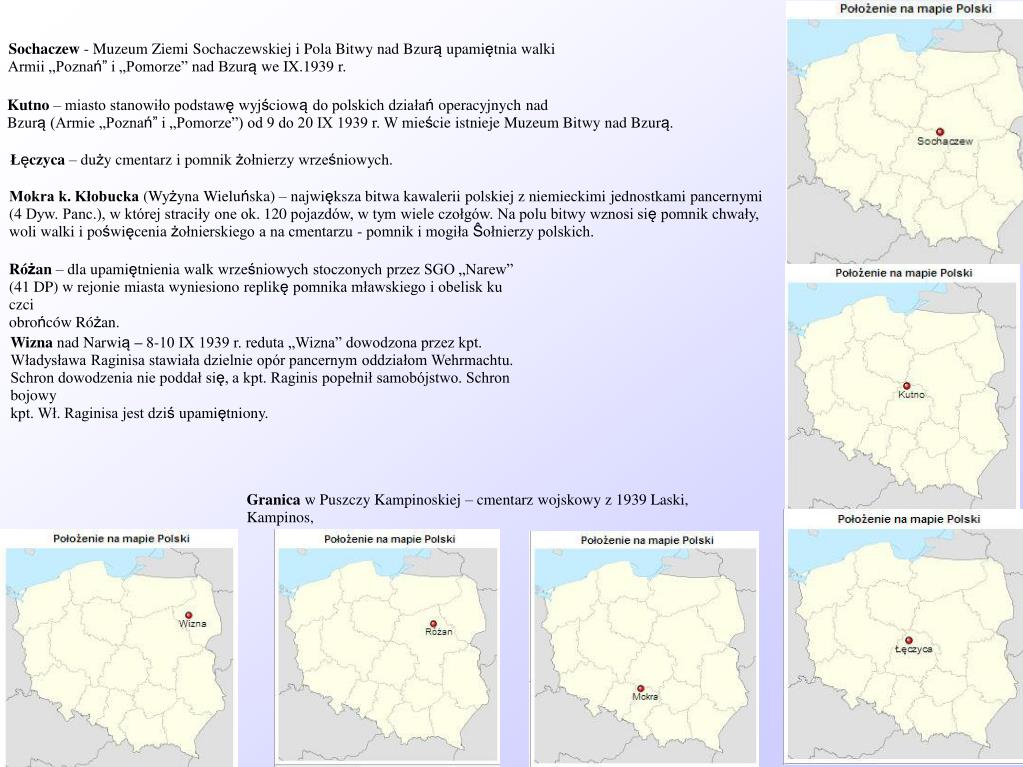 Sochaczew - Muzeum Ziemi Sochaczewskiej i Pola Bitwy nad Bzurą upamiętnia walki Armii „Poznań” i „Pomorze” nad Bzurą we IX.1939 r. Kutno – miasto stanowiło podstawę wyjściową do polskich działań operacyjnych nad Bzurą (Armie „Poznań” i „Pomorze”) od 9 do 20 IX 1939 r. W mieście istnieje Muzeum Bitwy nad Bzurą. Łęczyca – duży cmentarz i pomnik żołnierzy wrześniowych. Mokra k. Kłobucka (Wyżyna Wieluńska) – największa bitwa kawalerii polskiej z niemieckimi jednostkami pancernymi (4 Dyw. Panc.), w której straciły one ok. 120 pojazdów, w tym wiele czołgów. Na polu bitwy wznosi się pomnik chwały, woli walki i poświęcenia żołnierskiego a na cmentarzu - pomnik i mogiła Ŝołnierzy polskich. Różan – dla upamiętnienia walk wrześniowych stoczonych przez SGO „Narew” (41 DP) w rejonie miasta wyniesiono replikę pomnika mławskiego i obelisk ku czci obrońców Różan. Wizna nad Narwią – 8-10 IX 1939 r. reduta „Wizna” dowodzona przez kpt. Władysława Raginisa stawiała dzielnie opór pancernym oddziałom Wehrmachtu. Schron dowodzenia nie poddał się, a kpt. Raginis popełnił samobójstwo. Schron bojowy kpt. Wł. Raginisa jest dziś upamiętniony. Granica w Puszczy Kampinoskiej – cmentarz wojskowy z 1939 Laski, Kampinos,
