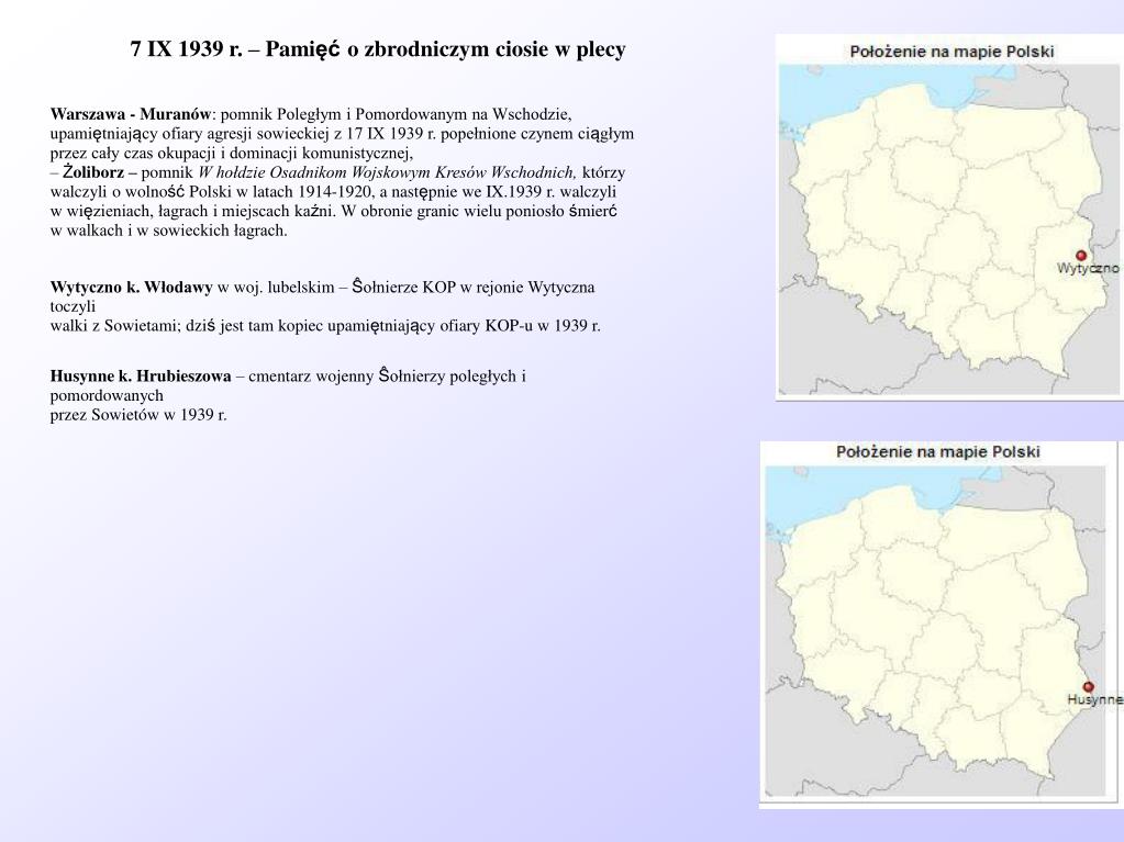 7 IX 1939 r. – Pamięć o zbrodniczym ciosie w plecy Warszawa - Muranów: pomnik Poległym i Pomordowanym na Wschodzie, upamiętniający ofiary agresji sowieckiej z 17 IX 1939 r. popełnione czynem ciągłym przez cały czas okupacji i dominacji komunistycznej, – Żoliborz – pomnik W hołdzie Osadnikom Wojskowym Kresów Wschodnich, którzy walczyli o wolność Polski w latach 1914-1920, a następnie we IX.1939 r. walczyli w więzieniach, łagrach i miejscach kaźni. W obronie granic wielu poniosło śmierć w walkach i w sowieckich łagrach. Wytyczno k. Włodawy w woj. lubelskim – Ŝołnierze KOP w rejonie Wytyczna toczyli walki z Sowietami; dziś jest tam kopiec upamiętniający ofiary KOP-u w 1939 r. Husynne k. Hrubieszowa – cmentarz wojenny Ŝołnierzy poległych i pomordowanych przez Sowietów w 1939 r.