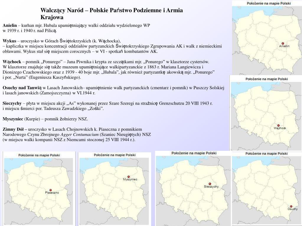 Walczący Naród – Polskie Państwo Podziemne i Armia Krajowa Anielin – kurhan mjr. Hubala upamiętniający walki oddziału wydzielonego WP w 1939 r. i 1940 r. nad Pilicą. Wykus – uroczysko w Górach Świętokrzyskich (k. Wąchocka), – kapliczka w miejscu koncentracji oddziałów partyzanckich Świętokrzyskiego Zgrupowania AK i walk z niemieckimi obławami. Wykus stał się miejscem corocznych – w VI - spotkań kombatantów AK. Wąchock – pomnik „Ponurego” – Jana Piwnika i krypta ze szczątkami mjr. „Ponurego” w klasztorze cystersów. W klasztorze znajduje się także muzeum upamiętniające walkipartyzanckie z 1863 r. Mariana Langiewicza i Dionizego Czachowskiego oraz z 1939 - 40 boje mjr. „Hubala”, jak równieżpartyzantkę akowską mjr. „Ponurego” i por. „Nurta” (Eugeniusza Kaszyńskiego). Osuchy nad Tanwią w Lasach Janowskich– upamiętnienie walk partyzanckich (cmentarz i pomnik) w Puszczy Solskiej i lasach janowskich (Zamojszczyzna) w VI.1944 r. Sieczychy – płyta w miejscu akcji „As” wykonanej przez Szare Szeregi na strażnicę Grenzschutzu 20 VIII 1943 r. i miejscu śmierci por. Tadeusza Zawadzkiego „Zośki”. Myszyniec (Kurpie) – pomnik żołnierzy NSZ. Zimny Dół – uroczysko w Lasach Chojnowskich k. Piaseczna z pomnikiem Narodowego Czynu Zbrojnego Agger Contumacium (Szaniec Nieugiętych) NSZ (w miejscu walki kompanii NSZ z Niemcami stoczonej 25 VIII 1944 r.).