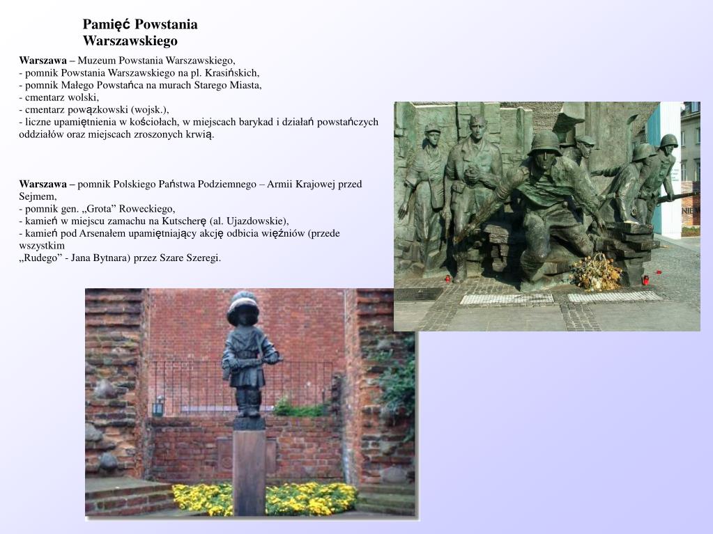 Pamięć Powstania Warszawskiego Warszawa – Muzeum Powstania Warszawskiego, - pomnik Powstania Warszawskiego na pl. Krasińskich, - pomnik Małego Powstańca na murach Starego Miasta, - cmentarz wolski, - cmentarz powązkowski (wojsk.), - liczne upamiętnienia w kościołach, w miejscach barykad i działań powstańczych oddziałów oraz miejscach zroszonych krwią. Warszawa – pomnik Polskiego Państwa Podziemnego – Armii Krajowej przed Sejmem, - pomnik gen. „Grota” Roweckiego, - kamień w miejscu zamachu na Kutscherę (al. Ujazdowskie), - kamień pod Arsenałem upamiętniający akcję odbicia więźniów (przede wszystkim „Rudego” - Jana Bytnara) przez Szare Szeregi.