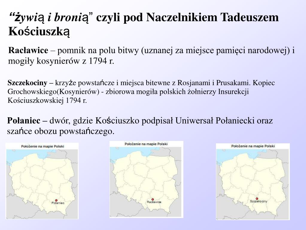 “żywią i bronią” czyli pod Naczelnikiem Tadeuszem Kościuszką Racławice – pomnik na polu bitwy (uznanej za miejsce pamięci narodowej) i mogiłykosynierów z 1794 r. Szczekociny – krzyże powstańcze i miejsca bitewne z Rosjanami i Prusakami. Kopiec Grochowskiego(Kosynierów) - zbiorowa mogiła polskich żołnierzy Insurekcji Kościuszkowskiej 1794 r. Połaniec – dwór, gdzie Kościuszko podpisał Uniwersał Połaniecki oraz szańce obozupowstańczego.
