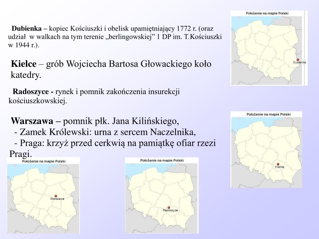Dubienka – kopiec Kościuszki i obelisk upamiętniający 1772 r. (oraz udział w walkach na tym terenie „berlingowskiej” 1 DP im. T.Kościuszki w 1944 r.). Kielce – grób Wojciecha Bartosa Głowackiego koło katedry. Radoszyce - rynek i pomnik zakończenia insurekcji kościuszkowskiej. Warszawa – pomnik płk. Jana Kilińskiego, - Zamek Królewski: urna z sercem Naczelnika, - Praga: krzyż przed cerkwią na pamiątkę ofiar rzezi Pragi.