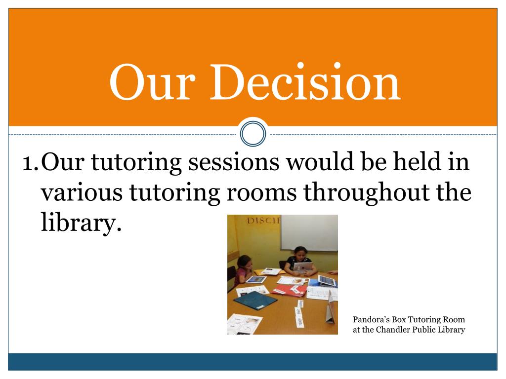 Our Decision Our tutoring sessions would be held in various tutoring rooms throughout the library. Pandora’s Box Tutoring Room at the Chandler Public Library
