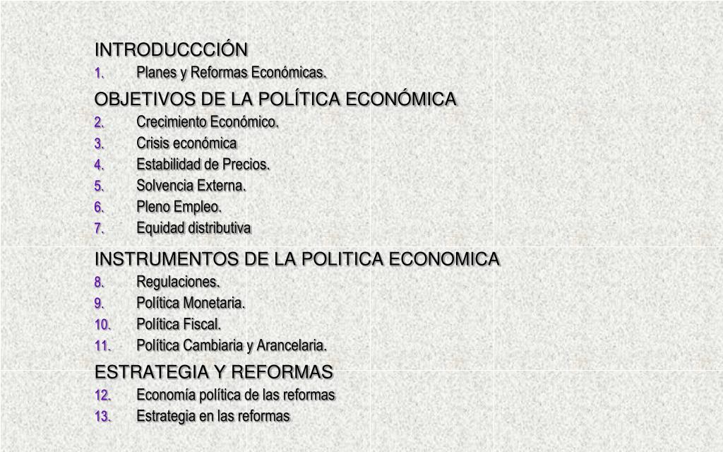 INTRODUCCCIÓN • Planes y Reformas Económicas. OBJETIVOS DE LA POLÍTICA ECONÓMICA • Crecimiento Económico. • Crisis económica • Estabilidad de Precios. • Solvencia Externa. • Pleno Empleo. • Equidad distributiva INSTRUMENTOS DE LA POLITICA ECONOMICA • Regulaciones. • Política Monetaria. • Política Fiscal. • Política Cambiaria y Arancelaria. ESTRATEGIA Y REFORMAS • Economía política de las reformas • Estrategia en las reformas