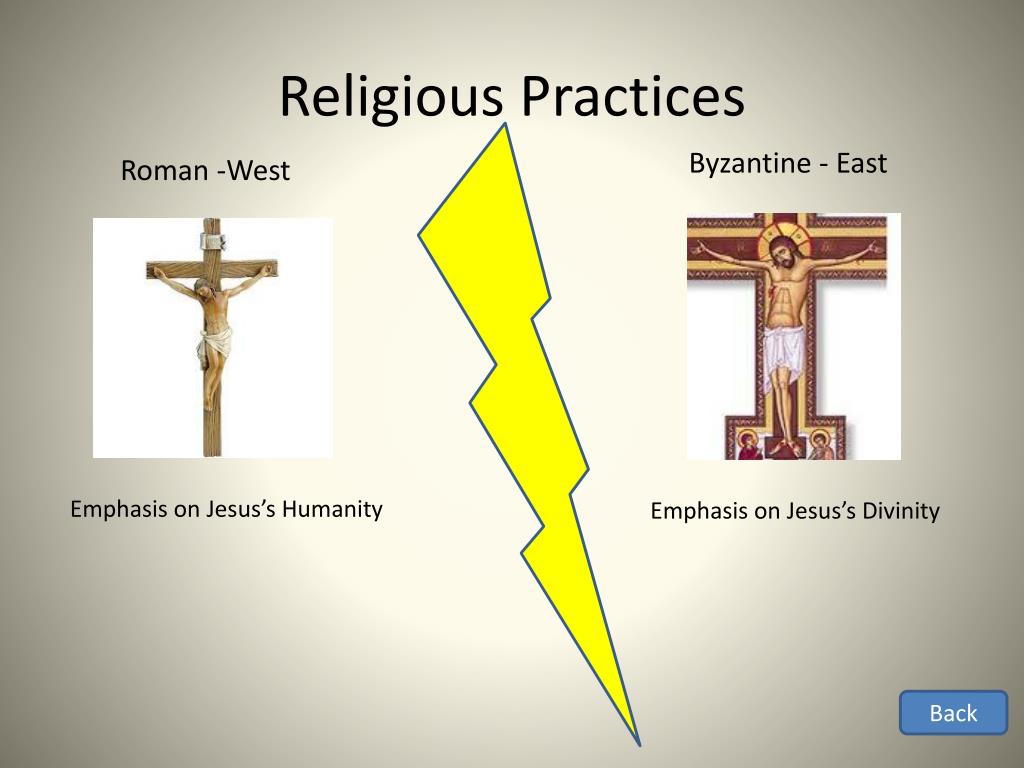 Religious Practices Roman -West Byzantine - East Emphasis on Jesus’s Humanity Emphasis on Jesus’s Divinity Back