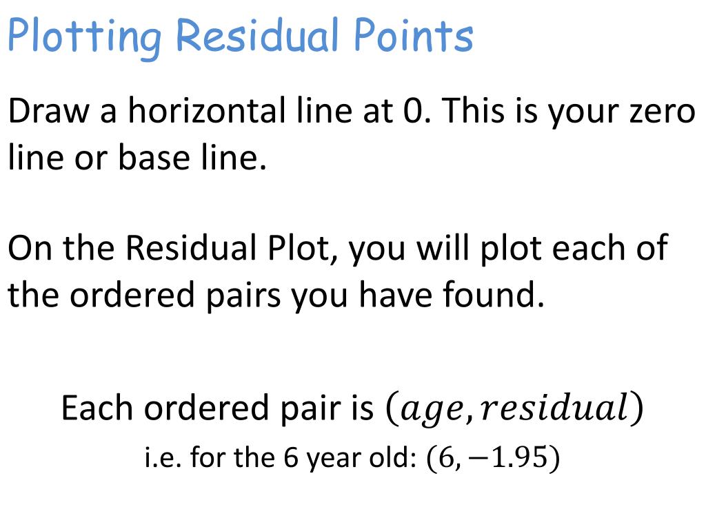 Plotting Residual Points Draw a horizontal line at 0. This is your zero line or base line. On the Residual Plot, you will plot each of the ordered pairs you have found. Each ordered pair is i.e. for the 6 year old:
