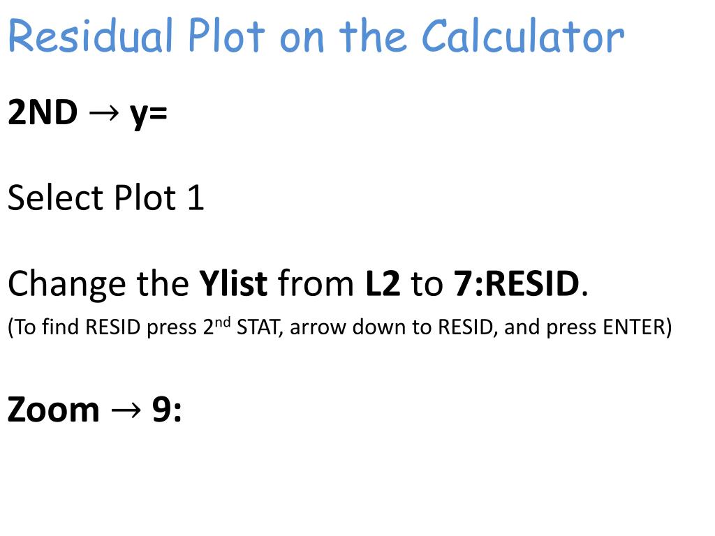 Residual Plot on the Calculator 2ND y= Select Plot 1 Change the Ylist from L2 to 7:RESID. (To find RESID press 2nd STAT, arrow down to RESID, and press ENTER) Zoom 9: