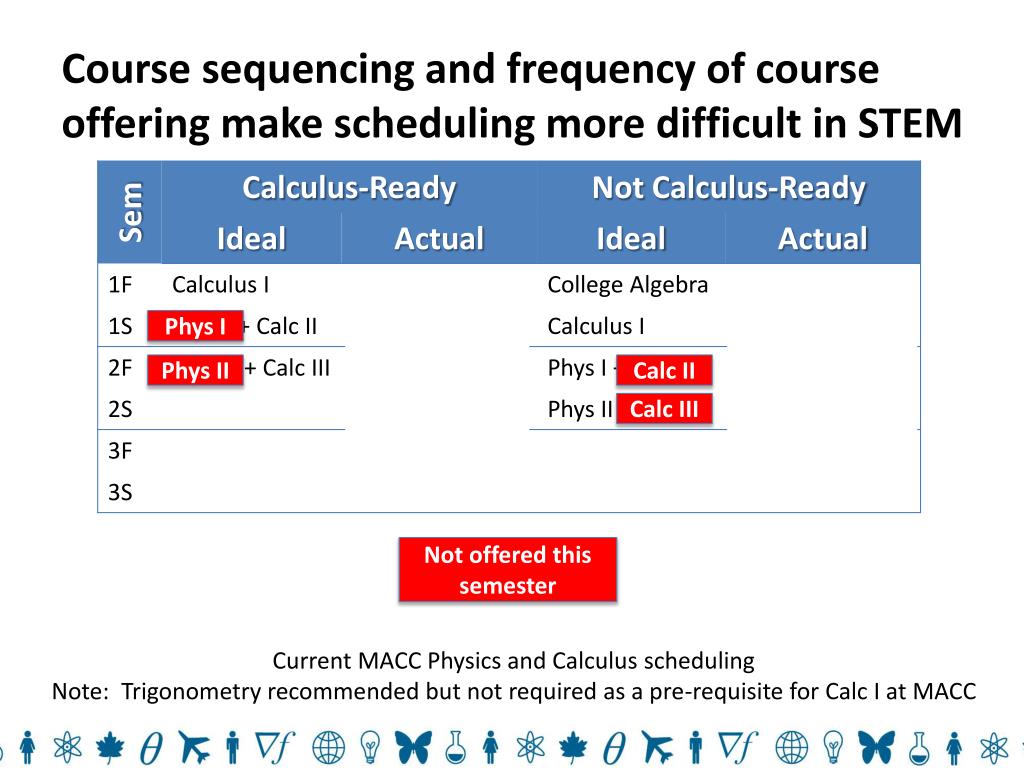 Course sequencing and frequency of course offering make scheduling more difficult in STEM Phys I Calc II Phys II Calc III Not offered this semester Current MACC Physics and Calculus scheduling Note: Trigonometry recommended but not required as a pre-requisite for Calc I at MACC
