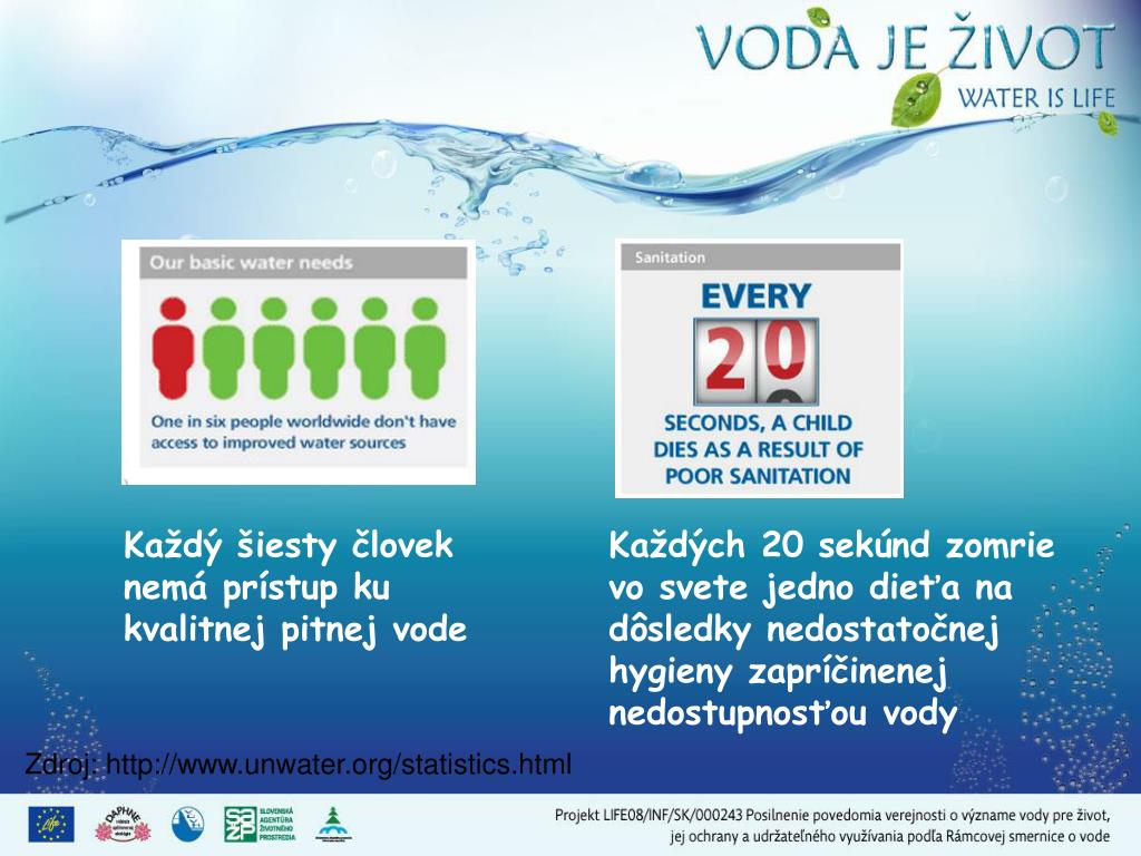 Každý šiesty človek nemá prístup ku kvalitnej pitnej vode Každých 20 sekúnd zomrie vo svete jedno dieťa na dôsledky nedostatočnej hygieny zapríčinenej nedostupnosťou vody Zdroj: http://www.unwater.org/statistics.html