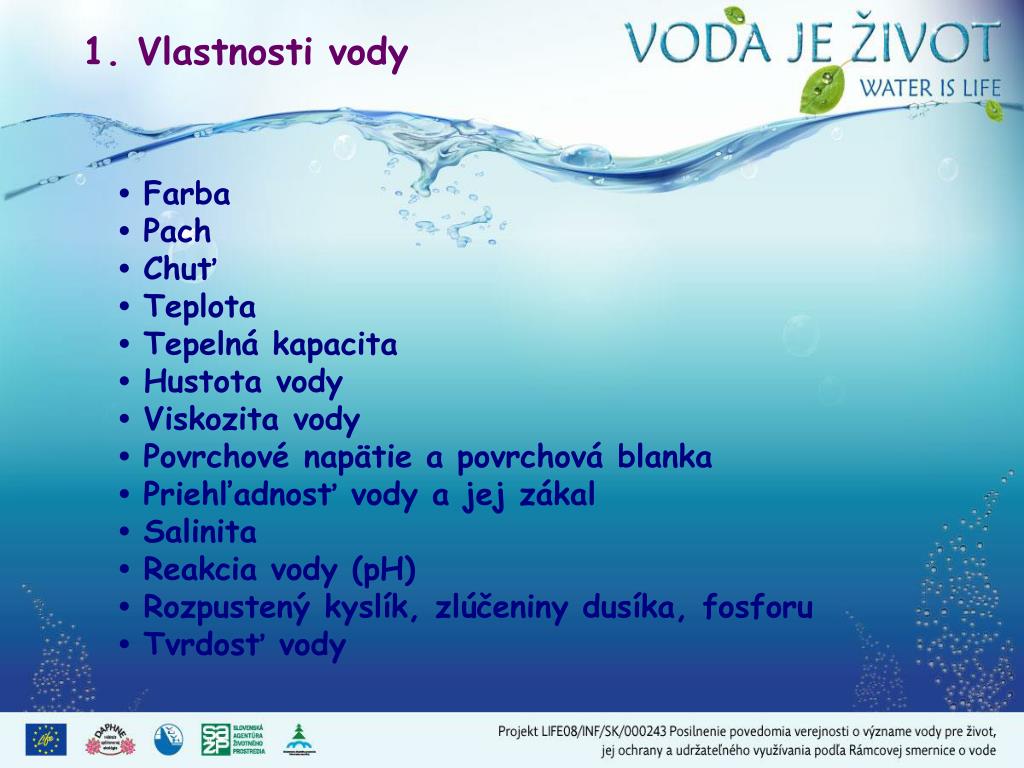 1. Vlastnosti vody • Farba • Pach • Chuť • Teplota • Tepelná kapacita • Hustota vody • Viskozita vody • Povrchové napätie a povrchová blanka • Priehľadnosť vody a jej zákal • Salinita • Reakcia vody (pH) • Rozpustený kyslík, zlúčeniny dusíka, fosforu • Tvrdosť vody