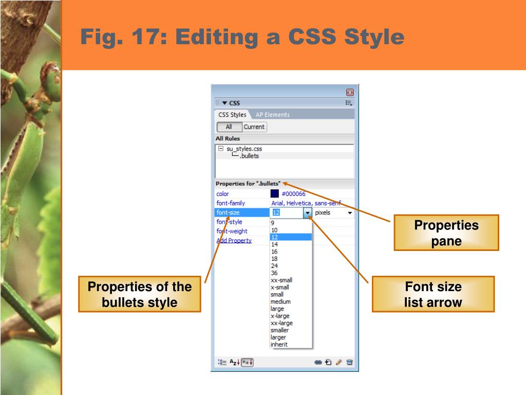 Fig. 17: Editing a CSS Style Properties pane Properties of the bullets style Font size list arrow
