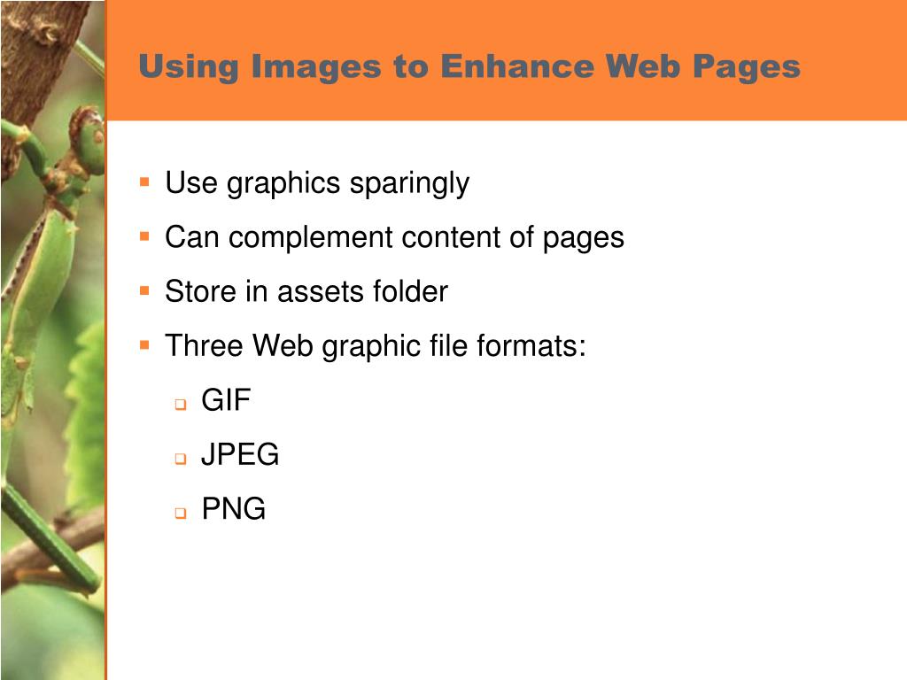 Using Images to Enhance Web Pages Use graphics sparingly Can complement content of pages Store in assets folder Three Web graphic file formats: GIF JPEG PNG