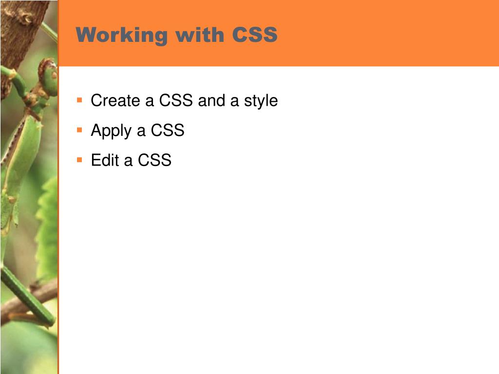 Working with CSS Create a CSS and a style Apply a CSS Edit a CSS