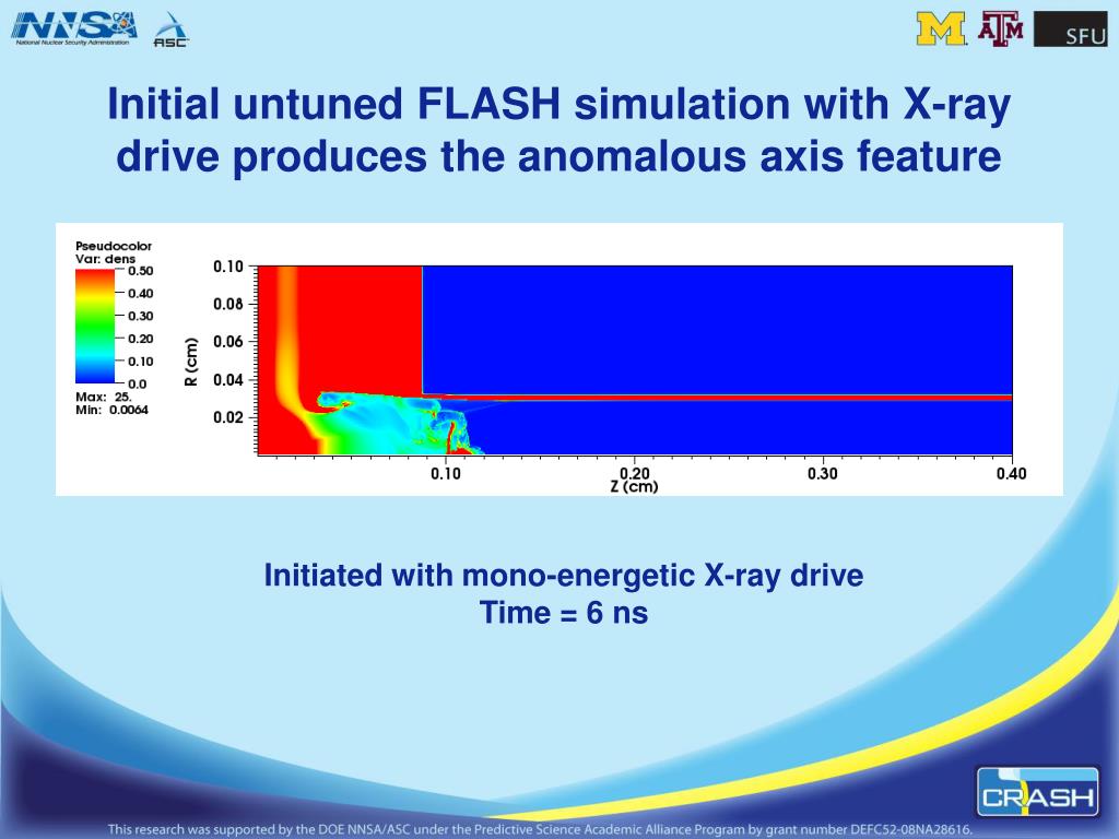 Initial untuned FLASH simulation with X-ray drive produces the anomalous axis feature Initiated with mono-energetic X-ray drive Time = 6 ns