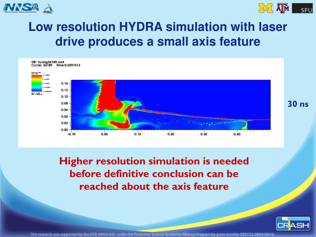 Low resolution HYDRA simulation with laser drive producesa small axis feature 30 ns Higher resolution simulation is neededbefore definitive conclusion can be reached about the axis feature