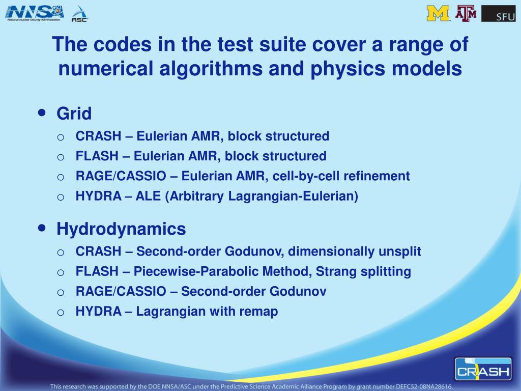 The codes in the test suite cover a range of numerical algorithms and physics models • Grid • CRASH – Eulerian AMR, block structured • FLASH – Eulerian AMR, block structured • RAGE/CASSIO – Eulerian AMR, cell-by-cell refinement • HYDRA – ALE (Arbitrary Lagrangian-Eulerian) • Hydrodynamics • CRASH – Second-order Godunov, dimensionally unsplit • FLASH – Piecewise-Parabolic Method, Strang splitting • RAGE/CASSIO – Second-order Godunov • HYDRA – Lagrangian with remap