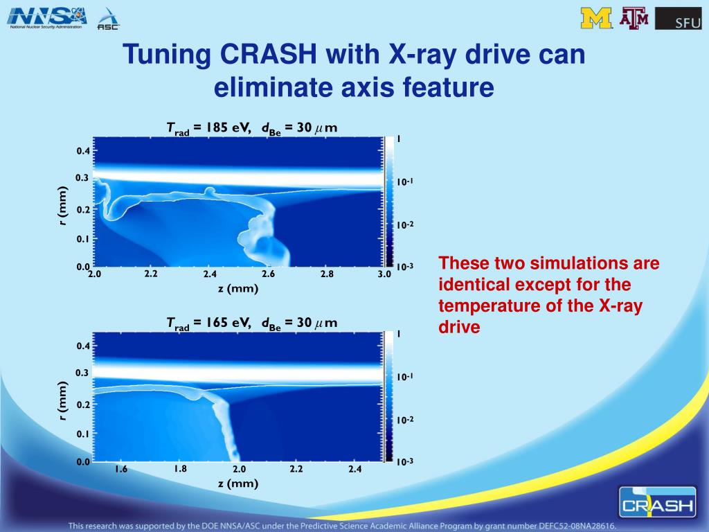 Tuning CRASH with X-ray drive caneliminate axis feature These two simulations are identical except for the temperature of the X-ray drive