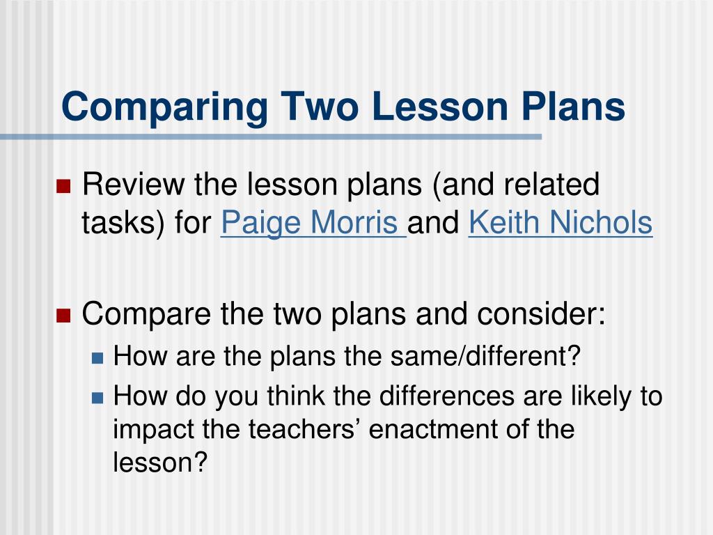 Comparing Two Lesson Plans • Review the lesson plans (and related tasks) for Paige Morris and Keith Nichols • Compare the two plans and consider: • How are the plans the same/different? • How do you think the differences are likely to impact the teachers’ enactment of the lesson?