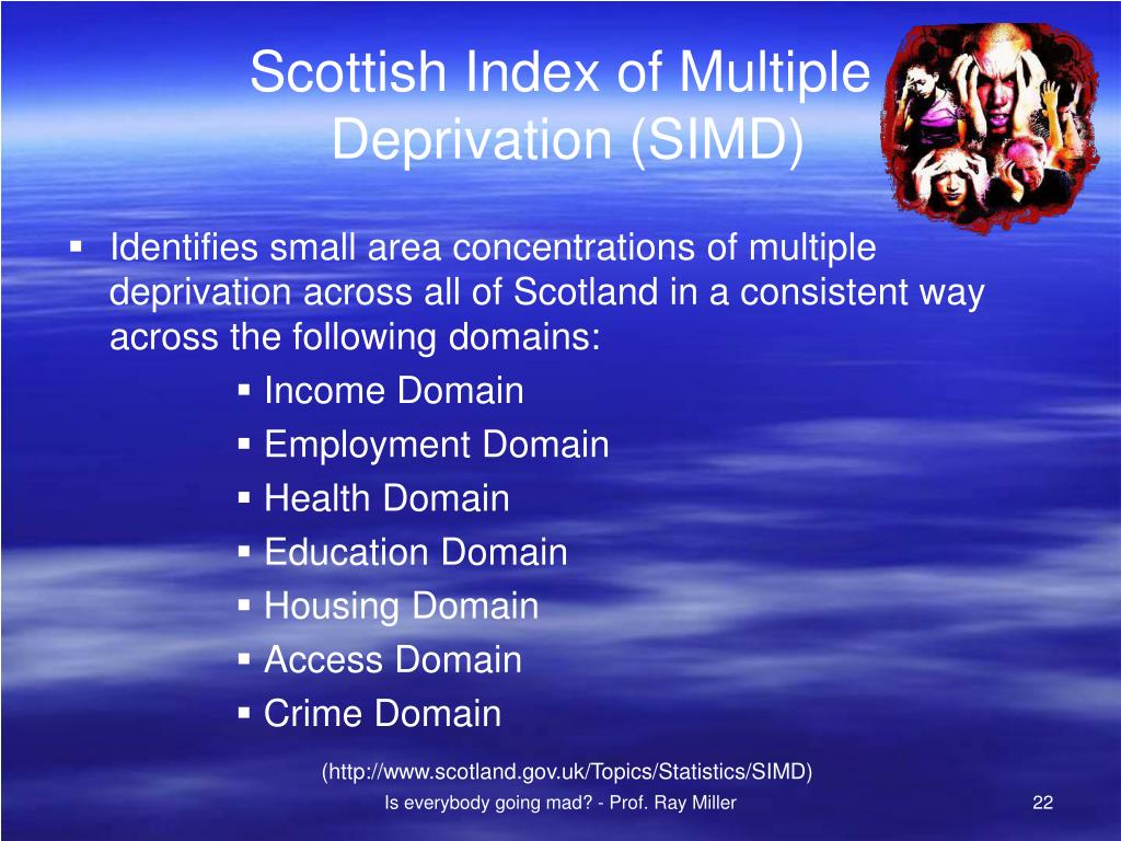 Scottish Index of Multiple Deprivation (SIMD) • Identifies small area concentrations of multiple deprivation across all of Scotland in a consistent way across the following domains: • Income Domain • Employment Domain • Health Domain • Education Domain • Housing Domain • Access Domain • Crime Domain (http://www.scotland.gov.uk/Topics/Statistics/SIMD) Is everybody going mad? - Prof. Ray Miller