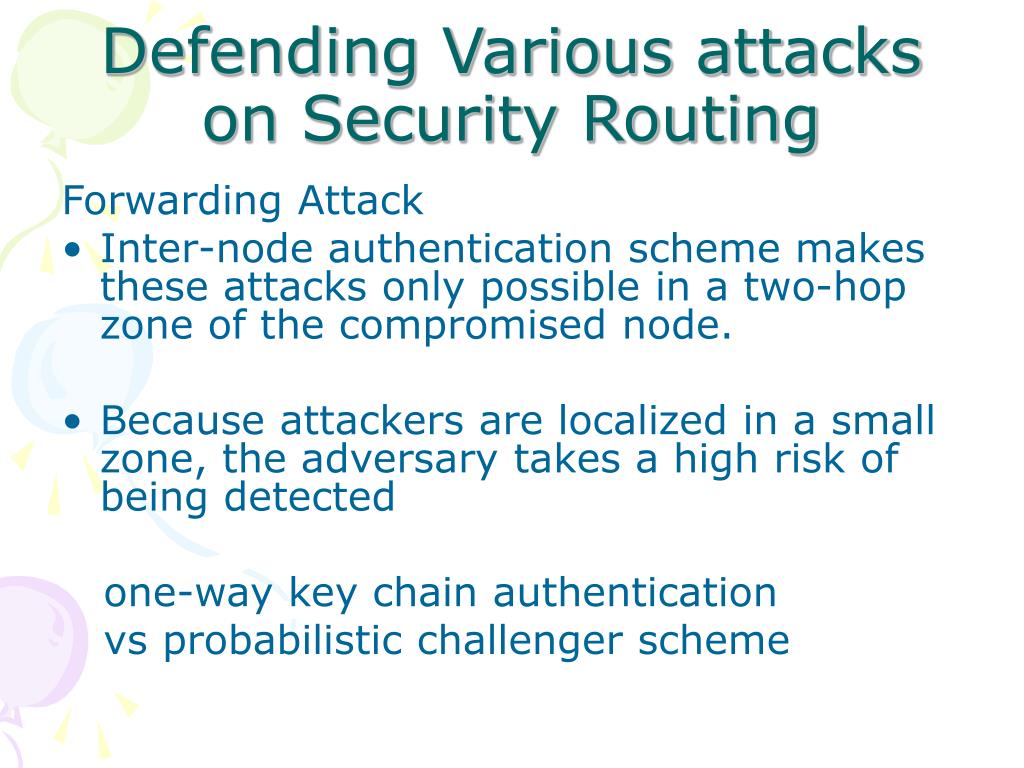 Defending Various attacks on Security Routing Forwarding Attack • Inter-node authentication scheme makes these attacks only possible in a two-hop zone of the compromised node. • Because attackers are localized in a small zone, the adversary takes a high risk of being detected one-way key chain authentication vs probabilistic challenger scheme