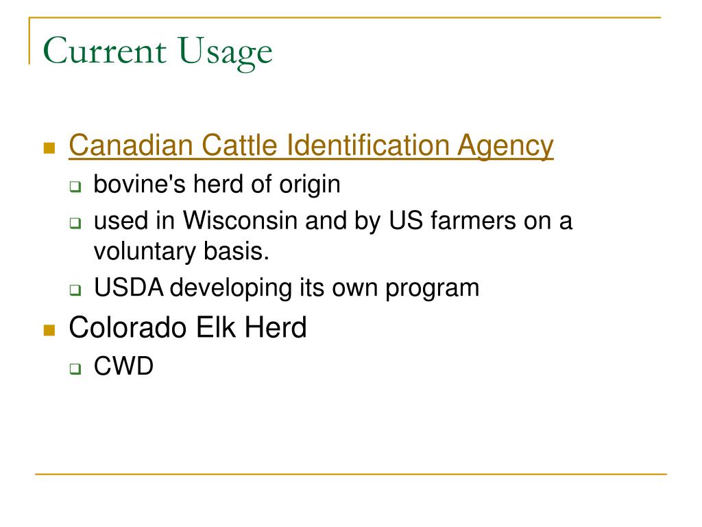 Current Usage • Canadian Cattle Identification Agency • bovine's herd of origin • used in Wisconsin and by US farmers on a voluntary basis. • USDA developing its own program • Colorado Elk Herd • CWD