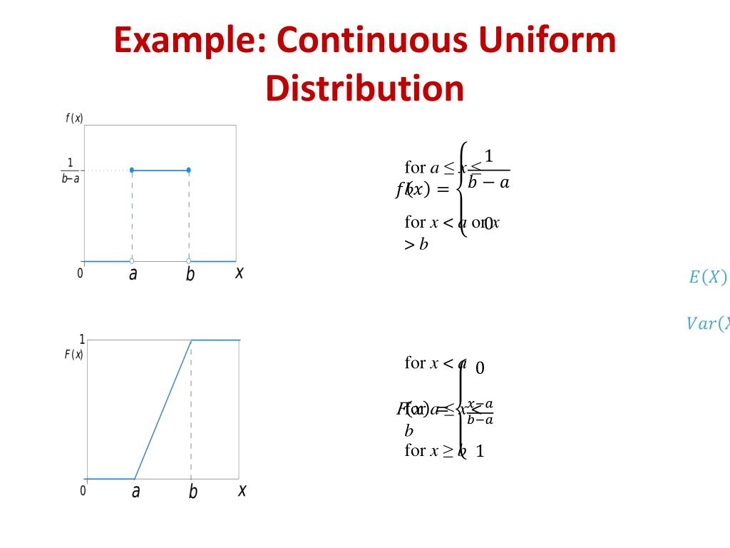Example: Continuous Uniform Distribution for a ≤ x ≤ b for x < a or x > b for x < a F for a ≤ x < b for x ≥ b