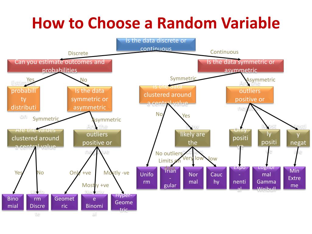 How to Choose a Random Variable Is the data discrete or continuous Continuous Discrete Can you estimate outcomes and probabilities Is the data symmetric or asymmetric Symmetric Yes Asymmetric No Is the data clustered around a central value Is the data symmetric or asymmetric Are the outliers positive or negative Estimate probability distribution No Yes Symmetric Asymmetric Are the values clustered around a central value Only positive Mostly positive Are the outliers positive or negative How likely are the outliers Mostly negative No outliers. Limits on data Very low low Expo-nential Lognormal Gamma Weibull Min Extreme Uniform Trian-gular Normal Cauchy No Yes Only +ve Mostly -ve Mostly +ve Geometric Negative Binomial Hyper-Geometric Binomial Uniform Discrete