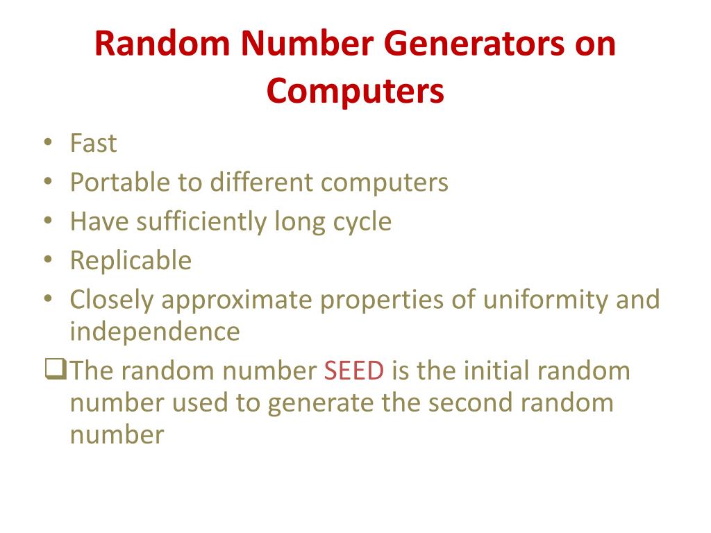 Random Number Generators on Computers • Fast • Portable to different computers • Have sufficiently long cycle • Replicable • Closely approximate properties of uniformity and independence • The random number SEED is the initial random number used to generate the second random number