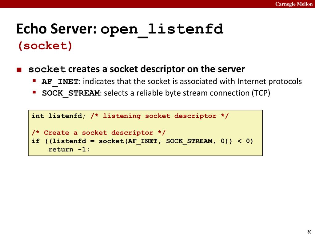 Echo Server: open_listenfd int open_listenfd(int port) { int listenfd, optval=1; struct sockaddr_in serveraddr; /* Create a socket descriptor */ if ((listenfd = socket(AF_INET, SOCK_STREAM, 0)) < 0) return -1; /* Eliminates "Address already in use" error from bind. */ if (setsockopt(listenfd, SOL_SOCKET, SO_REUSEADDR, (const void *)&optval , sizeof(int)) < 0) return -1; ... <more>