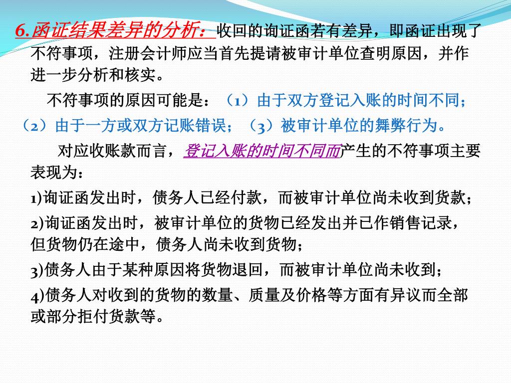 6.函证结果差异的分析:收回的询证函若有差异,即函证出现了不符事项,注册会计师应当首先提请被审计单位查明原因,并作进一步分析和核实。6.函证结果差异的分析:收回的询证函若有差异,即函证出现了不符事项,注册会计师应当首先提请被审计单位查明原因,并作进一步分析和核实。 不符事项的原因可能是:(1)由于双方登记入账的时间不同; (2)由于一方或双方记账错误;(3)被审计单位的舞弊行为。 对应收账款而言,登记入账的时间不同而产生的不符事项主要表现为: 1)询证函发出时,债务人已经付款,而被审计单位尚未收到货款; 2)询证函发出时,被审计单位的货物已经发出并已作销售记录,但货物仍在途中,债务人尚未收到货物; 3)债务人由于某种原因将货物退回,而被审计单位尚未收到; 4)债务人对收到的货物的数量、质量及价格等方面有异议而全部或部分拒付货款等。